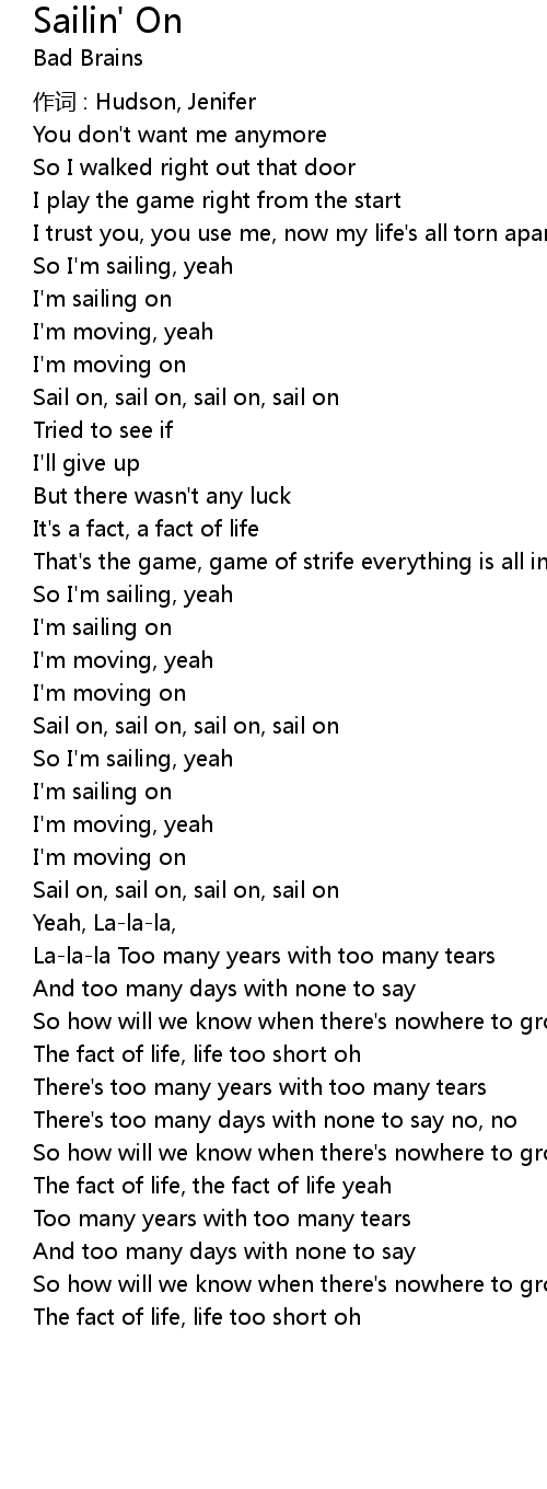 Bad brains sailin\' on lyrics. Sail on sail on. This song is a Bad Brains cover as it thrashes repeatedly for just over a minute and a half and then plays acoustic instrumental resembling Bob Marley for the remainder of this track. So Im sailin well Im sailin on.